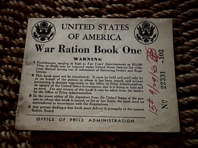 A short while after my mother passed away, I received a package from my cousin in the mail. My mom and her mom (my mom’s sister) passed away within one week of each other. She had been going through her mom’s things, and found a few items of my mother’s. Of interest, there were four War Ration books issued to my mom, who at the time in 1942 was age 9, 3 ft 11 inches tall, and 60 lbs. (according to the information recorded in the book). Issued by the Office of Price Administration, the coupons were to be used for the fair rationing of items that were scarce during the war. Many types of things were rationed: food, coffee, gasoline, tires, shoes, sugar. Items critical to the war effort were mainly what rations were assigned to. It was a fairly complex, color coded, points based system that was ultimately designed to provide for the distribution of these scarce commodities. And with every well intentioned system that is designed, naturally, ill-intended people found a way to circumvent the rules. A black market was created, and hoarding became a key component and unsavory underbelly to this well-intended program. Anything sounding vaguely familiar?